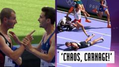 GB’s George Mills confronts France’s Hugo Hay as he is one of multiple runners to fall in the final straight of…